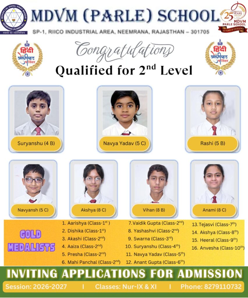 In the Hindi Olympiad, students achieved 16 Gold, 13 Silver, and 12 Bronze Medals, with 7 students qualifying for the second level. Additionally, 10 students have been selected for the Mathematics Olympiad (Level II) and 3 students for the Science Olympiad (Level II).