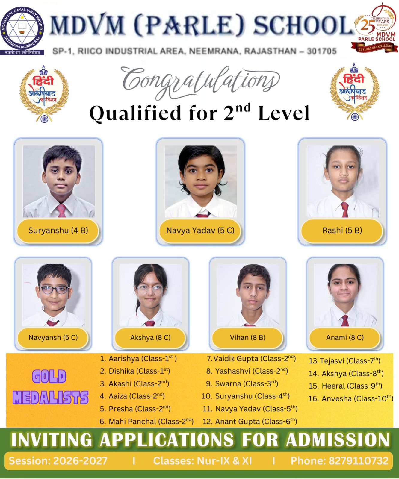 In the Hindi Olympiad, students achieved 16 Gold, 13 Silver, and 12 Bronze Medals, with 7 students qualifying for the second level. Additionally, 10 students have been selected for the Mathematics Olympiad (Level II) and 3 students for the Science Olympiad (Level II).